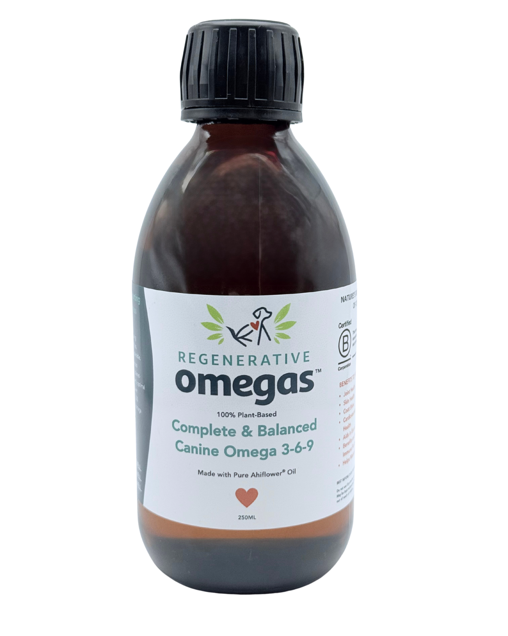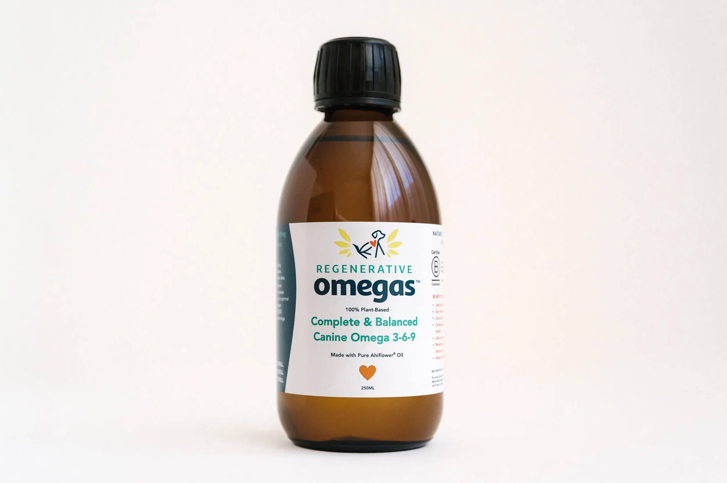 Regenerative Omegas for Canine is 100% plant-based, made with nature’s richest source of omega-3, Ahiflower® oil.